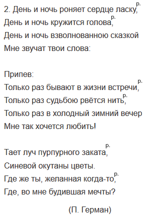Помните ли вы наизусть слова современных песен, романсов? Знаете ли фамилии авторов слов? Проверьте себя и запишите по памяти 2-3 куплета из разных песен или из одной песни, укажите фамилию автора (авторов) слов. Если в тексте есть разделительные знаки препинания, то надпишите над ними букву р.