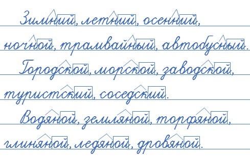 Образуйте от имён существительных имена прилагательные с помощью данных суффиксов. Запишите. Выделите суффиксы и окончания прилагательных.