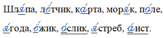 Шл_́па, л_́тчик, к_́рта, мор_́к, п_́ле, _́года, _́жик, _́слик, _́стреб, _́ист.
