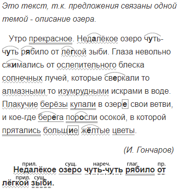 Утро прекрас(?)ное. Недалёкое озеро ч..ть-ч..ть р..било2 от лё..кой зыби.4 Глаза невольно сж..мались от ослепительного блеска солнечных лучей1, которые св..ркали то алмазными, то изумрудными искрами в воде. Плакучие берёзы купали в озер.. свои ветви, и кое-где бер..га пор..ели осокой, в которой прятались больш..е ж..лтые цветы.