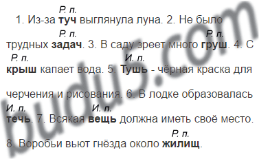 - из-за туч (Р. п.), задач (Р. п.), груш (Р. п.), крыш (Р. п.), жилищ (Р. п.) - в родительном падеже мн. числа после шипящих ь не ставится